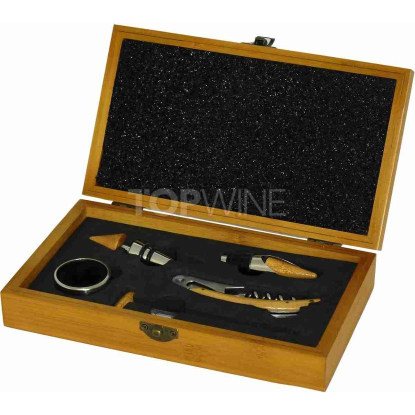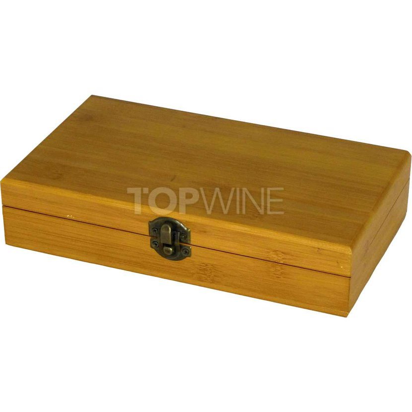 Drevená darčeková krabička - bambus s vinárskou súpravou. Zaujímavé prevedenie darčekového setu vinárskych pomôcok, ktoré sa hodí aj ako dekoratívny predmet.
