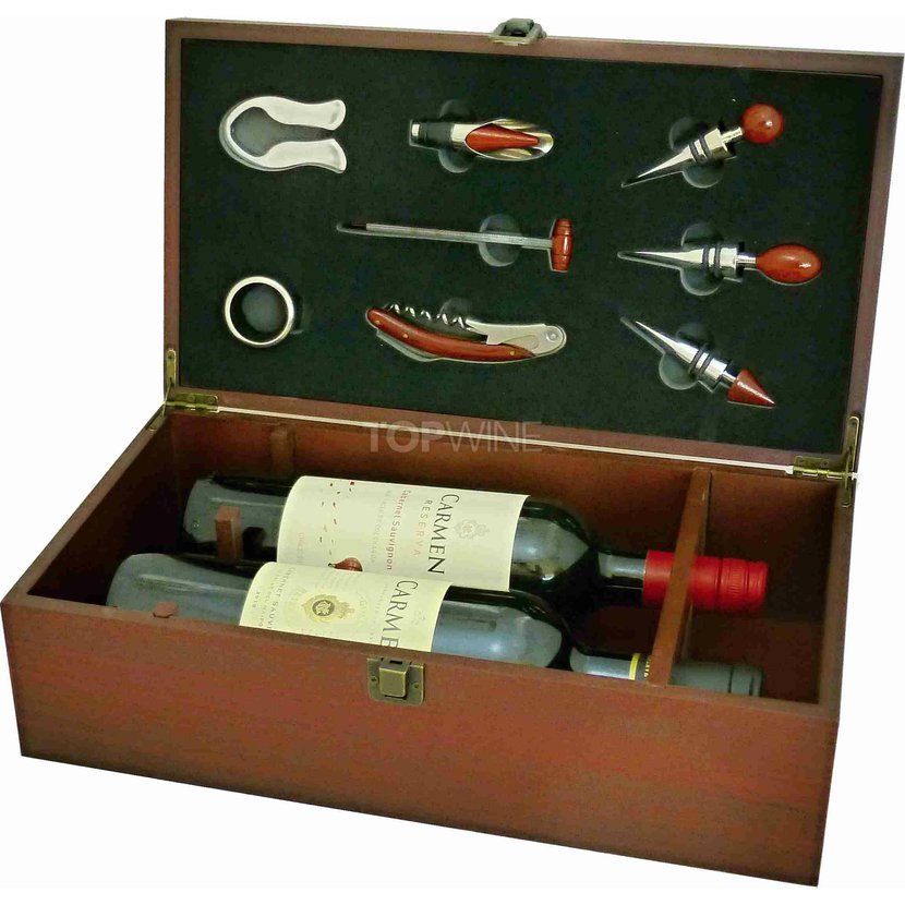 Box na 2 vína v prevedení mahagón a s vinárskymi pomôckami je dôstojným darčekovým obalom na rôzne príležitosti.