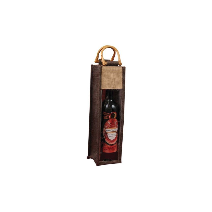 Tmavšia alternatíva klasickej jutovej tašky. Hnedá jutová taška pôsobí elegantne a priehľadná predná strane nechá vyniknúť etikete vína, ktoré chcete darovať. vhodná pre klasické 0,75 l fľaše, ale aj 0,5 l.