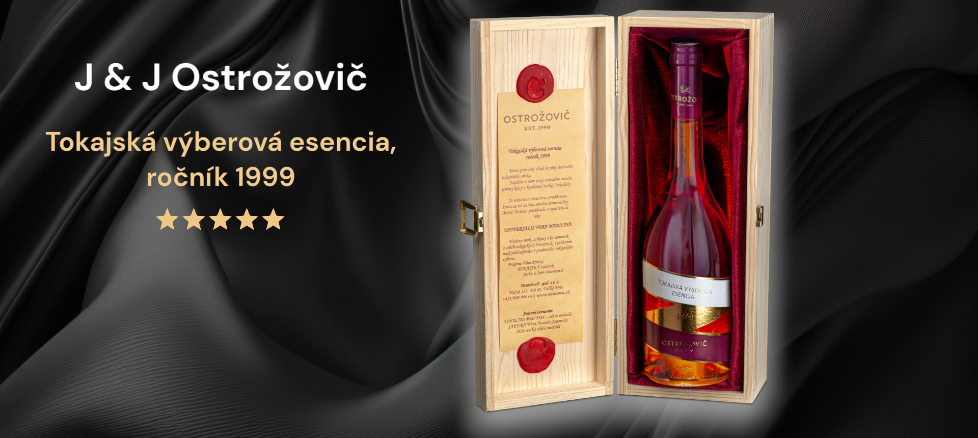 Tokajská esencia: Absolútny vrchol. Je to čistý extrakt z cibéb, ktorý kvasí len veľmi pomaly. Je to najvzácnejšia tekutina, akú môžete v slovenskom vinárstve ochutnať. Naša Tokajská výberová esencia 1999 od Ostrožoviča je klenotom, ktorý by nemal chýbať v žiadnej serióznej zbierke.